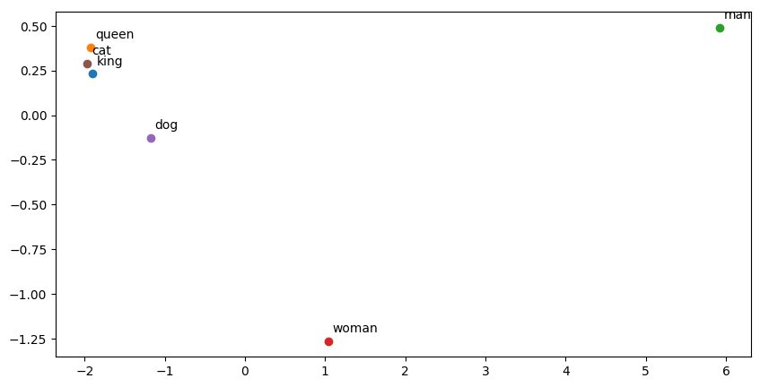 To visualize word embeddings in a 2D space, we can use dimensionality reduction techniques like PCA (Principal Component Analysis) or t-SNE. Below is an example using PCA.