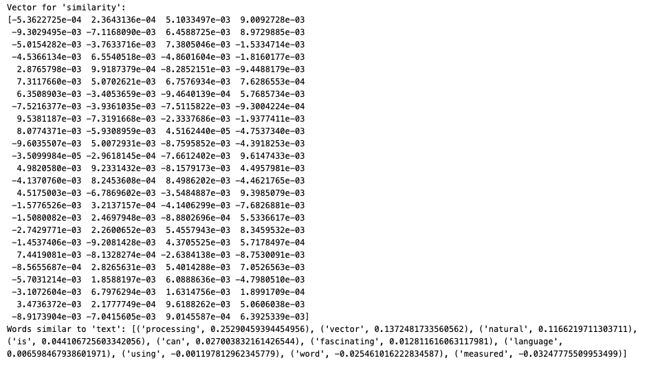 word_vector print(f"Vector for 'similarity':\n{word_vector}")