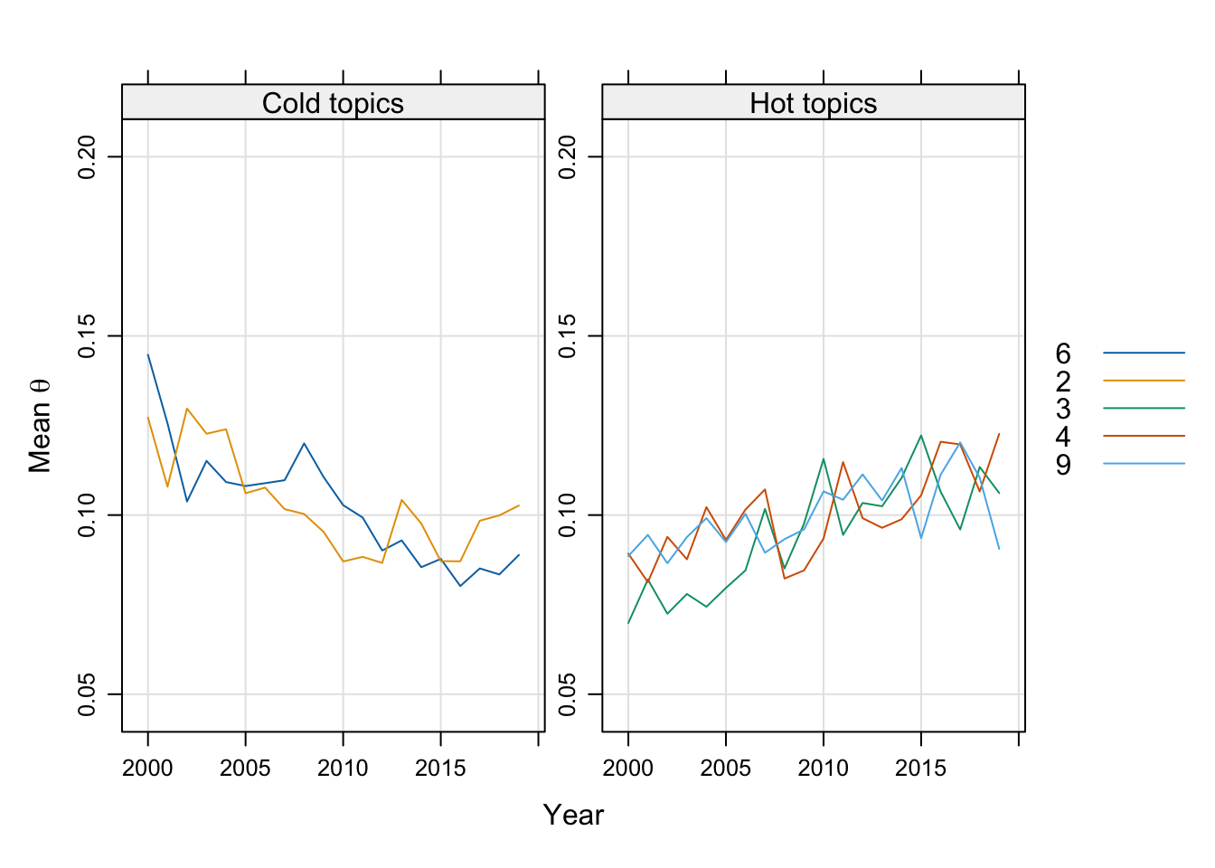 library(lattice)# Select top hot and cold topics for visualizationtopics_cold <-as.numeric(names(sort(theta_mean_lm_coef_slope[significance_neg[[2]]], decreasing =FALSE)))topics_hot <-as.numeric(names(sort(theta_mean_lm_coef_slope[significance_pos[[2]]], decreasing =TRUE)))# Combine selected hot and cold topics into a single time series matrixcold_and_hot_ts <-cbind(theta_mean_by_year_ts[, topics_cold[1:2]], theta_mean_by_year_ts[, topics_hot[1:3]], deparse.level =0) # Adjust numbers as needed# Rename columns to indicate topic numberscolnames(cold_and_hot_ts) <-as.character(c(topics_cold[1:2], topics_hot[1:3]))# Plot hot and cold topics over timeprint(xyplot(cold_and_hot_ts, layout =c(2, 1), screens =c(rep("Cold topics", 2), rep("Hot topics", 3)), # Adjust as neededsuperpose =TRUE, ylim =c(0.05, 0.2), ylab =expression(paste("Mean ", theta)), xlab ="Year", type =c("l", "g"), auto.key =list(space ="right"), scales =list(x =list(alternating =FALSE))))